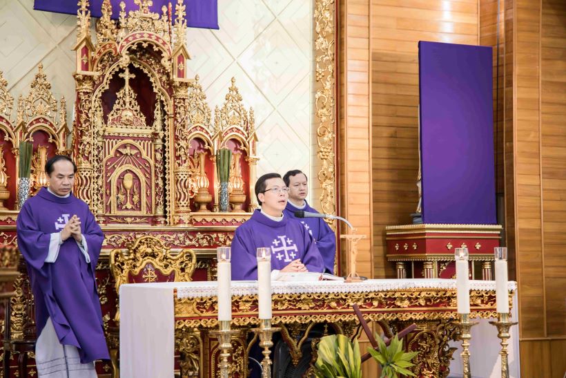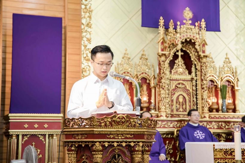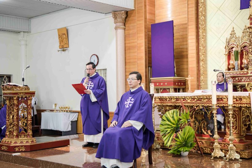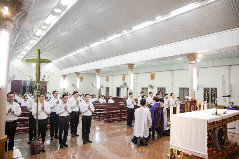 Mở đầu thánh lễ, cha Đaminh đã khơi lên bầu khí thiêng thánh của những ngày Tuần Thánh với cao điểm là Tam Nhật Vượt Qua, cách đặc biệt với anh em lớp Tu Đức trong ngày nhận tu phục. Ngài nhắc nhớ quý thầy: “Đây chính là dấu ấn đặc biệt trong đời dâng hiến của anh em, để mỗi người thêm hăng say, nhiệt thành cho ơn gọi theo Thầy Giêsu phục vụ và đem ơn cứu độ đến cho mọi người.” Cha cũng mời gọi cộng đoàn hiện diện cầu nguyện cho Đức cha cố Giuse, quý cha giáo, quý thầy thân yêu của Đại Chủng viện đã an nghỉ trong Chúa.