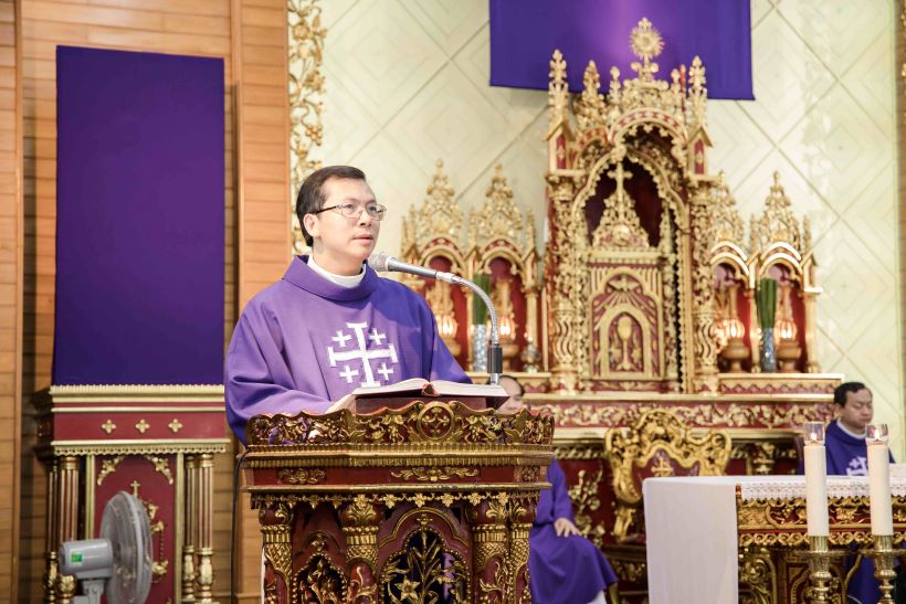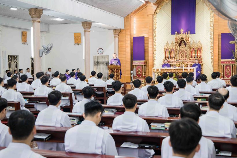 Mở đầu bài giảng, khởi đi từ bài đọc thứ nhất trích sách ngôn sứ Isaia, cha giảng lễ đã nhắc lại mầu nhiệm ơn gọi của Người Tôi Trung. Ngài nhắn nhủ rằng không phải ngẫu nhiên mà mỗi người chúng ta có mặt trên cuộc đời hay hiện diện nơi Chủng viện này, nhưng đó là do lòng nhân hậu và kế hoạch yêu thương vô cùng của Thiên Chúa với mỗi người. Tiếp theo, qua đoạn Tin Mừng theo thánh Gioan 13, 21-33.36-38, ngài cũng nói lên cốt cách của người môn đệ đi theo Chúa Giêsu: đi cùng, đi sát Thầy để được đào luyện và căn tính của người môn đệ được rõ nét hơn. Khoác lên mình tấm áo của người môn đệ nhưng phải là người môn đệ đích thực, đừng giống như Giuđa Iscariốt được Chúa Giêsu và các Tông đồ tin tưởng trao cho nhiệm vụ giữ túi tiền nhưng ông đã làm mọi người thất vọng vì sự bất trung, phản bội Thầy mình; hay một Phêrô mạnh mẽ tuyên bố liều chết vì Thầy, nhưng cũng vấp phải những sa ngã, yếu đuối, chối bỏ Thầy mình.