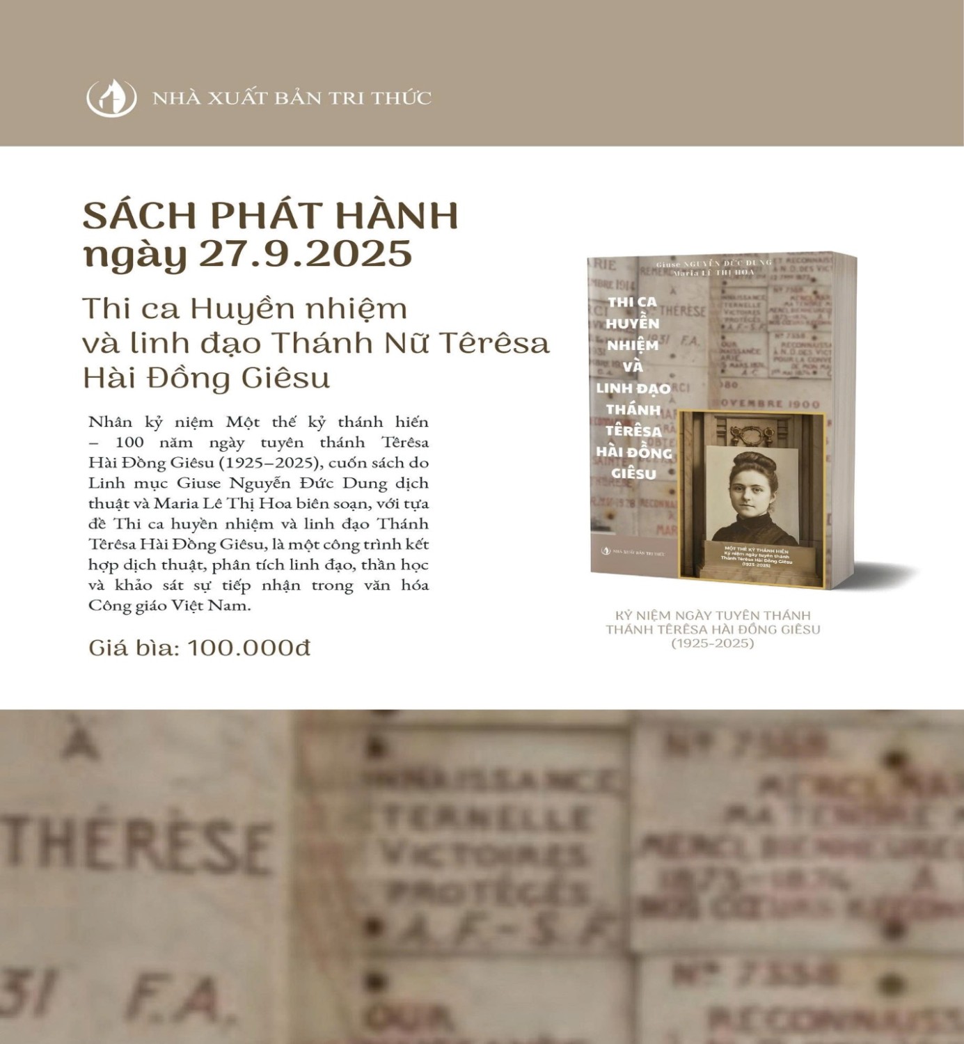 Tôi rất vui mừng nhận được tác phẩm Thi ca và linh đạo Thánh Têrêsa Hài Đồng Giêsu do Linh mục Giuse Nguyễn Đức Dung và Maria Lê Thị Hoa dịch thuật và biên tập; Đức Cha Giuse Đinh Đức Đạo, nguyên Giám mục Giáo phận Xuân Lộc, viết lời tựa; Nhà Xuất bản Trí thức (Hà Nội) ấn hành ngày 27 tháng 9 năm 2025. Xin hân hạnh được giới thiệu với cộng đồng Công giáo Việt Nam tác phẩm mới mẻ này.