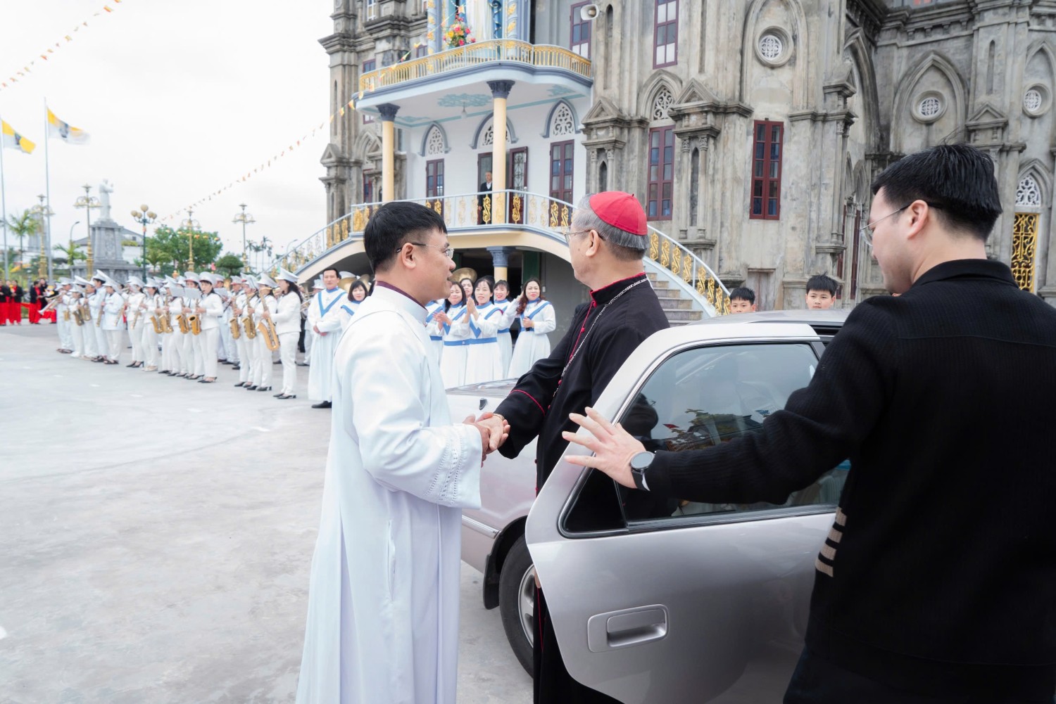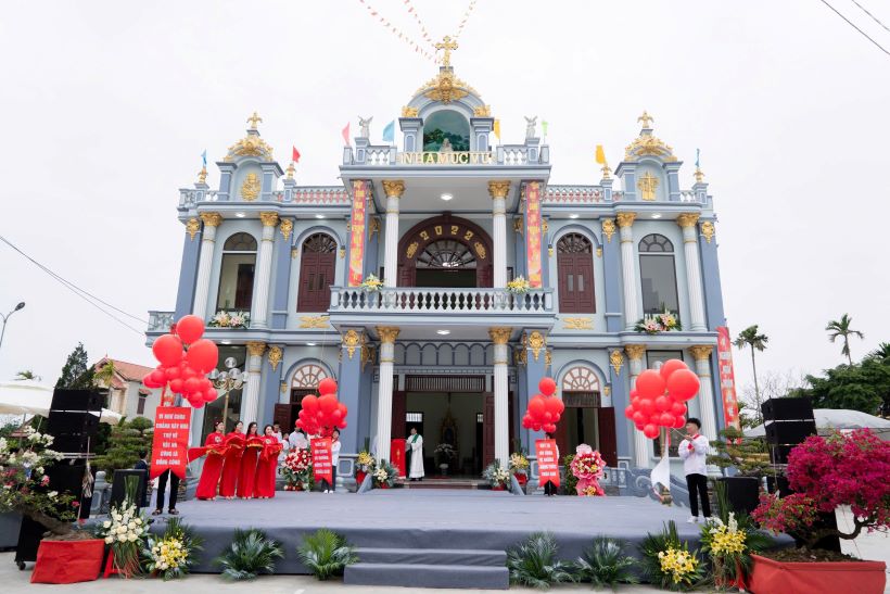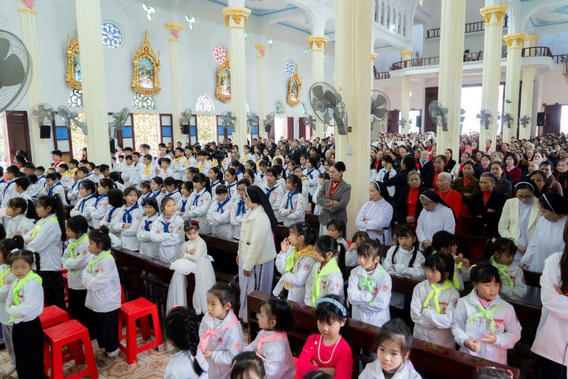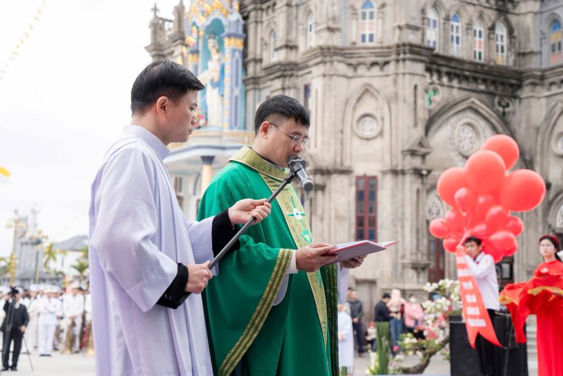 Sau nghi thức làm phép tòa nhà mới, đoàn lễ nghi cùng với các đoàn hội và đông đảo cộng đoàn, giữa tiếng kèn trống rộn rã tưng bừng, hân hoan tiến bước vào trong Thánh đường của Giáo họ, để cùng đến với cao điểm là Thánh lễ Tạ ơn do Đức cha Tôma chủ tế.