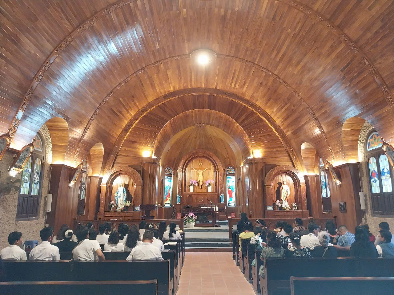 Sau bữa ăn trưa đầy thịnh tình, một số cá nhân đã đi tham quan nhà thờ và khuôn viên ngay trong lúc nghỉ trưa và trước khi chương trình chung cho đoàn được bắt đầu. Thú thực, chúng tôi không nghĩ là nơi đây lại có ngôi nhà thờ ở vị trí trung tâm và ở trên cao như vậy. Tuy nhiên, khi dành ít thời gian để tìm hiểu quần thể của giáo xứ này thì không hết sự sửng sốt, vì vào năm 1937 nơi đây rất bề thế với các công trình khác bao bọc ngôi thánh đường như nhà xứ, nhà nghỉ dưỡng, nhà bếp, nhà ăn, thư viện, và nhà các bà sơ...