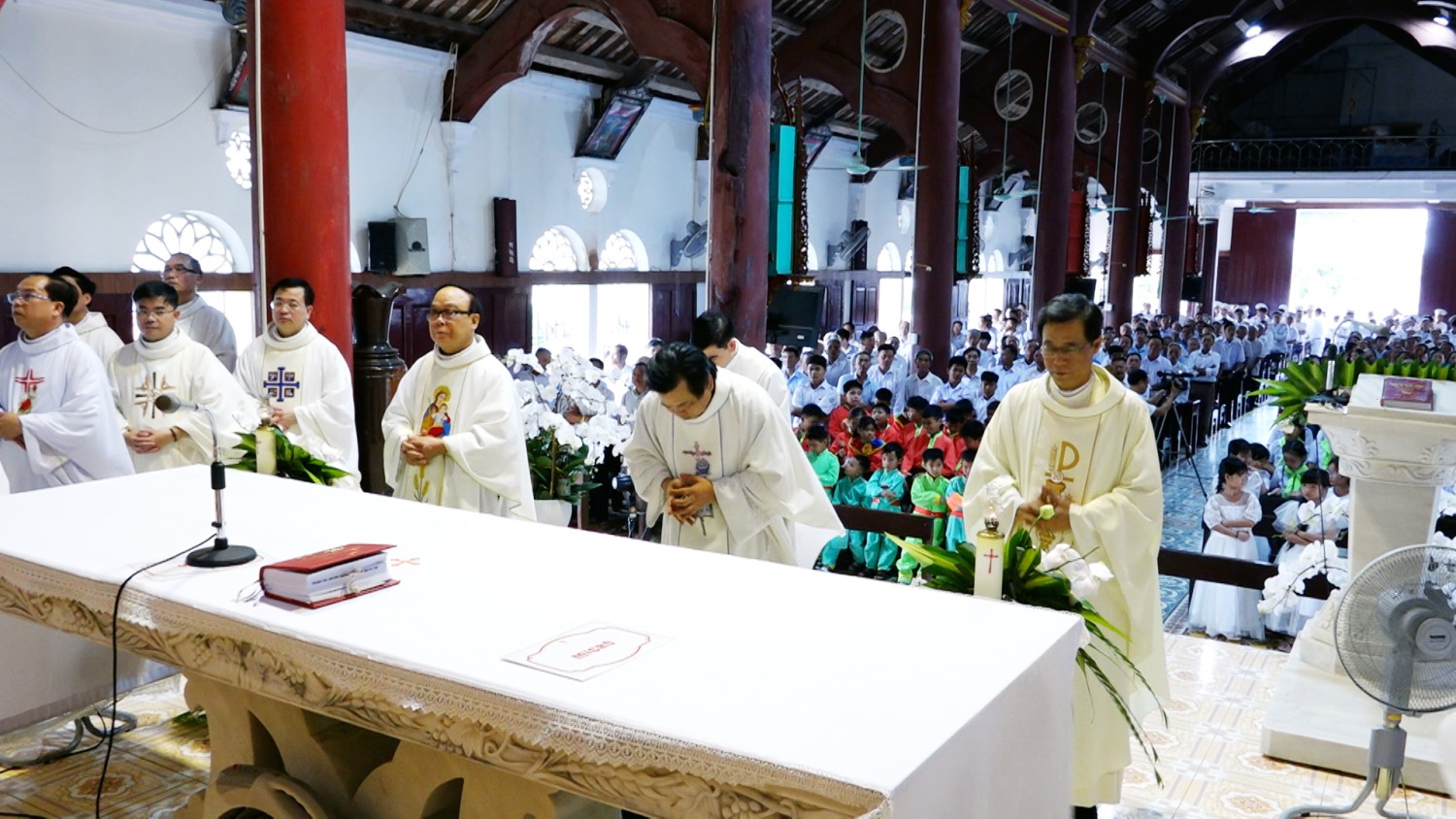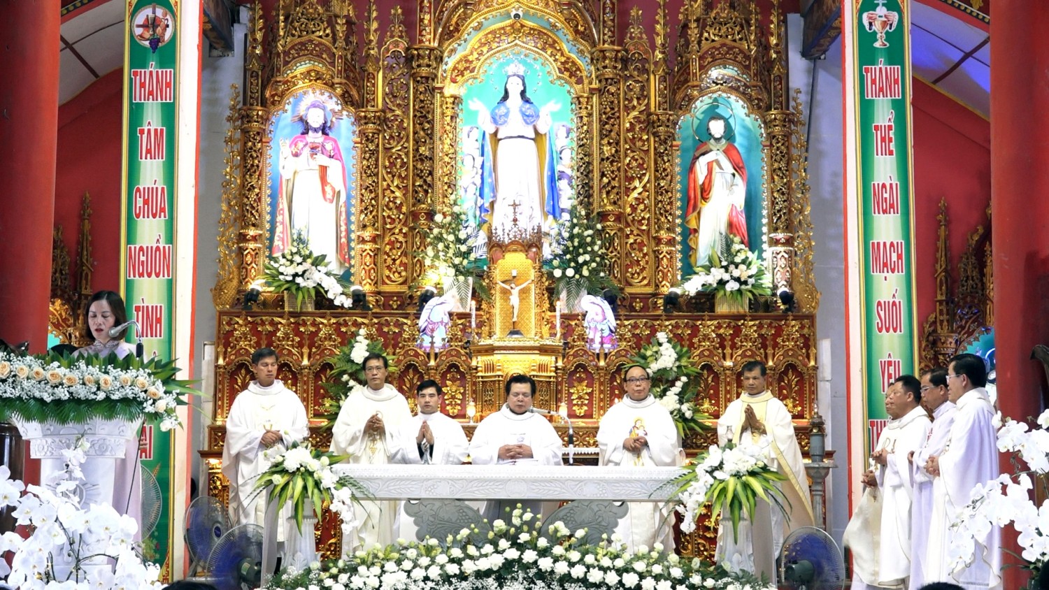 Cao điểm của tuần Chầu là Thánh lễ đồng tế, do cha quản hạt Giuse Mai Văn Châu chủ tế. Đúng 9h30’, giữa tiếng kèn, tiếng trống tươi vui, rộn ràng, đoàn đồng tế cùng các hội đoàn trang nghiêm tiến ra Thánh đường để cùng nhau cử hành Thánh lễ rất trọng thể. Đồng tế trong Thánh lễ có quý Cha trong và ngoài Giáo phận. Đông đảo quý tu sĩ, quý khách và cộng đoàn dân Chúa cũng hiện diện, làm cho bầu khí Phụng vụ thêm phần long trọng và sốt sắng.
