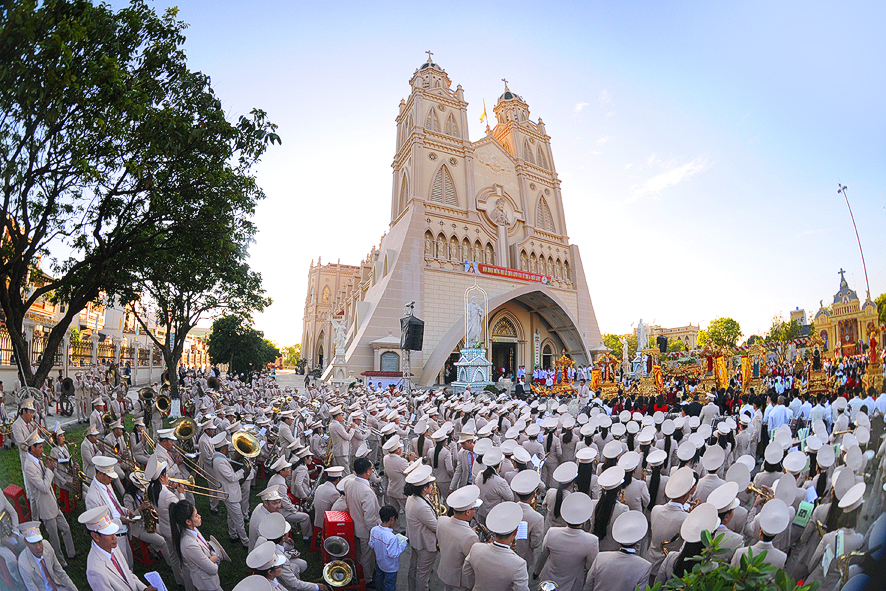 Chiều thứ Bảy, ngày 22/11/2025, toàn thể Giáo xứ long trọng tổ chức cuộc rước kiệu Chúa Kitô Vua, Đức Mẹ và Các Thánh. Dưới ánh hoàng hôn dịu nhẹ và tiết trời se lạnh của những ngày đầu Đông, đoàn rước trải dài, đầy trang nghiêm, sốt sắng, chầm chậm tiến bước giữa thanh âm lắng đọng của lời kinh, câu hát hòa quyện cùng tiếng trống, tiếng kèn rộn ràng của hơn 700 nhạc công trong liên đoàn kèn hiệp miền Đại Đồng. Mọi thành phần dân Chúa từ các hội đoàn, giáo họ, thiếu nhi, giới trẻ cho đến các cụ cao niên đều chung một tâm tình tôn vinh Vua Vũ Trụ và cầu xin phúc lành cho Giáo phận, Giáo xứ, cho từng gia đình và mỗi người.