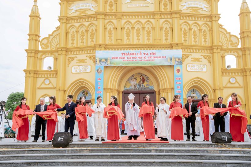 Sau lời giới thiệu sơ lược trên, Đức Cha Tôma, Cha xứ Giuse và các vị đại diện, đã cắt băng khánh thành ngôi Thánh đường mới. Những gương mặt rạng rỡ với những tràng pháo tay nồng nhiệt, hòa cùng tiếng kèn trống, tiếng pháo hoa và những hồi chuông rộn rã, phần nào diễn tả niềm vui vỡ òa, thỏa lòng mong đợi bấy lâu của toàn thể cộng đoàn Giáo xứ. Tiếp đến, mọi người cùng với Đức Cha Tôma và đoàn đồng tế hân hoan tiến vào bên trong ngôi Thánh đường để hiệp dâng Thánh lễ Tạ ơn.