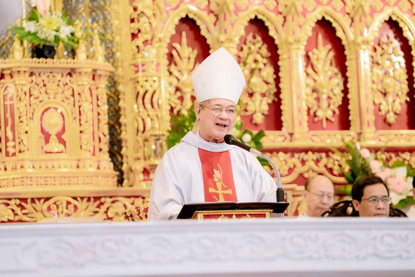 Trong bài giảng, Đức cha Tôma khơi lên trong cộng đoàn niềm vui đích thực của ngày trọng đại này. Niềm vui đó không được dừng lại ở cảm xúc hời hợt bên ngoài: có nhà thờ mới, có đông cha về dự lễ…, nhưng phải là niềm vui thánh thiêng, sâu xa, khi ý thức được ngôi Thánh đường là dấu chỉ sự hiện diện của Thiên Chúa giữa nhân loại, diễn tả sự hiệp thông giữa Thiên Chúa và con người và giữa con người với nhau. Chính Thiên Chúa quy tụ con cái Ngài trong nhà của Ngài, để nuôi dưỡng họ bằng Lời Hằng Sống và nhất là bằng Mình Máu của chính Đức Kitô, Con Thiên Chúa. Trong nhà của Chúa, mọi người sống mối dây hiệp thông mật thiết với nhau, cùng kết hợp với hy tế bàn thờ thập giá của Đức Giêsu, để tạ ơn Thiên Chúa Cha, xin ơn tha thứ, xin Chúa chúc lành cho cộng đoàn và từng người.