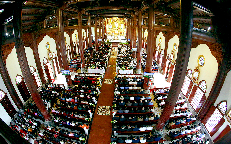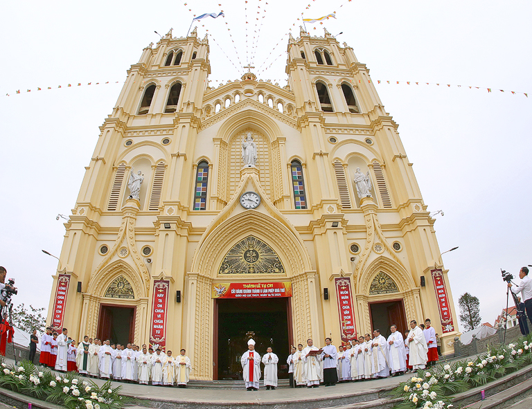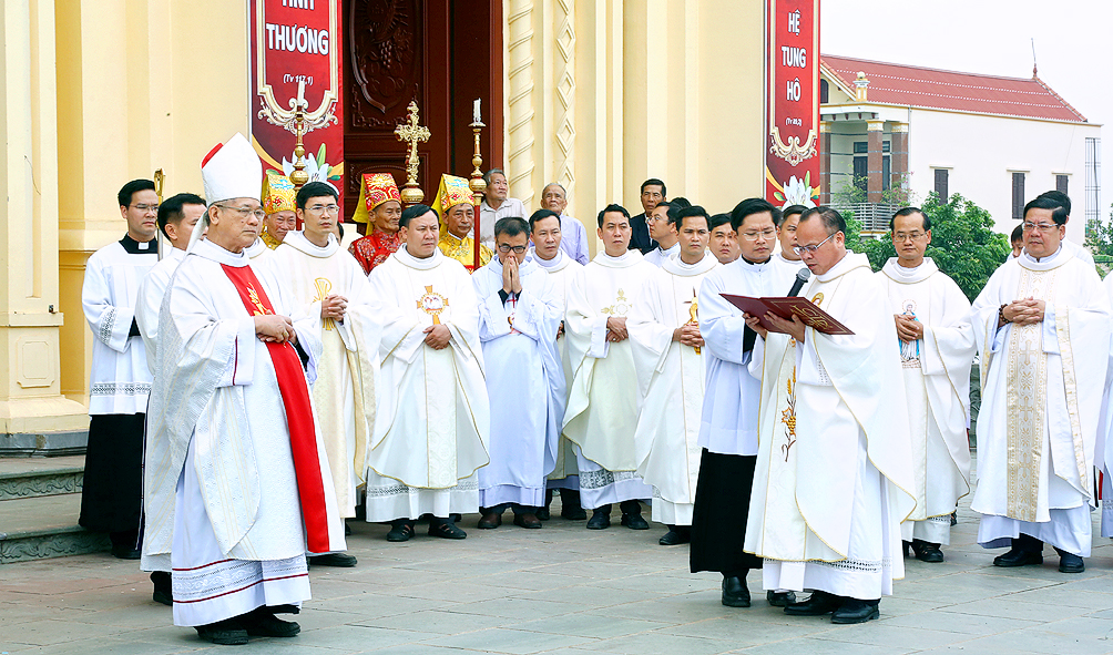 Trên khuôn viên ngôi nhà thờ mới khang trang, mọi người hân hoan chào đón Đức Cha Tôma Vũ Đình Hiệu, Giám mục Giáo phận Bùi Chu, hơn 40 quý cha trong và ngoài giáo phận, quý tu sĩ nam nữ cùng đông đảo quý khách xa gần quy tụ về hiệp dâng Thánh lễ.