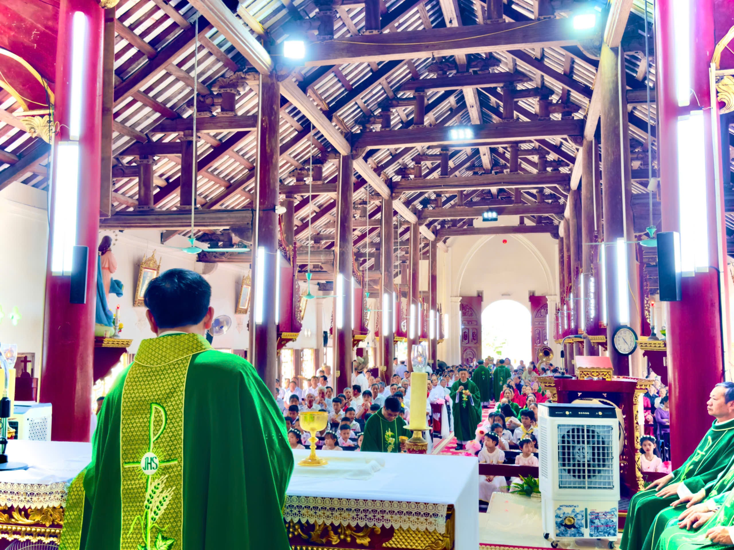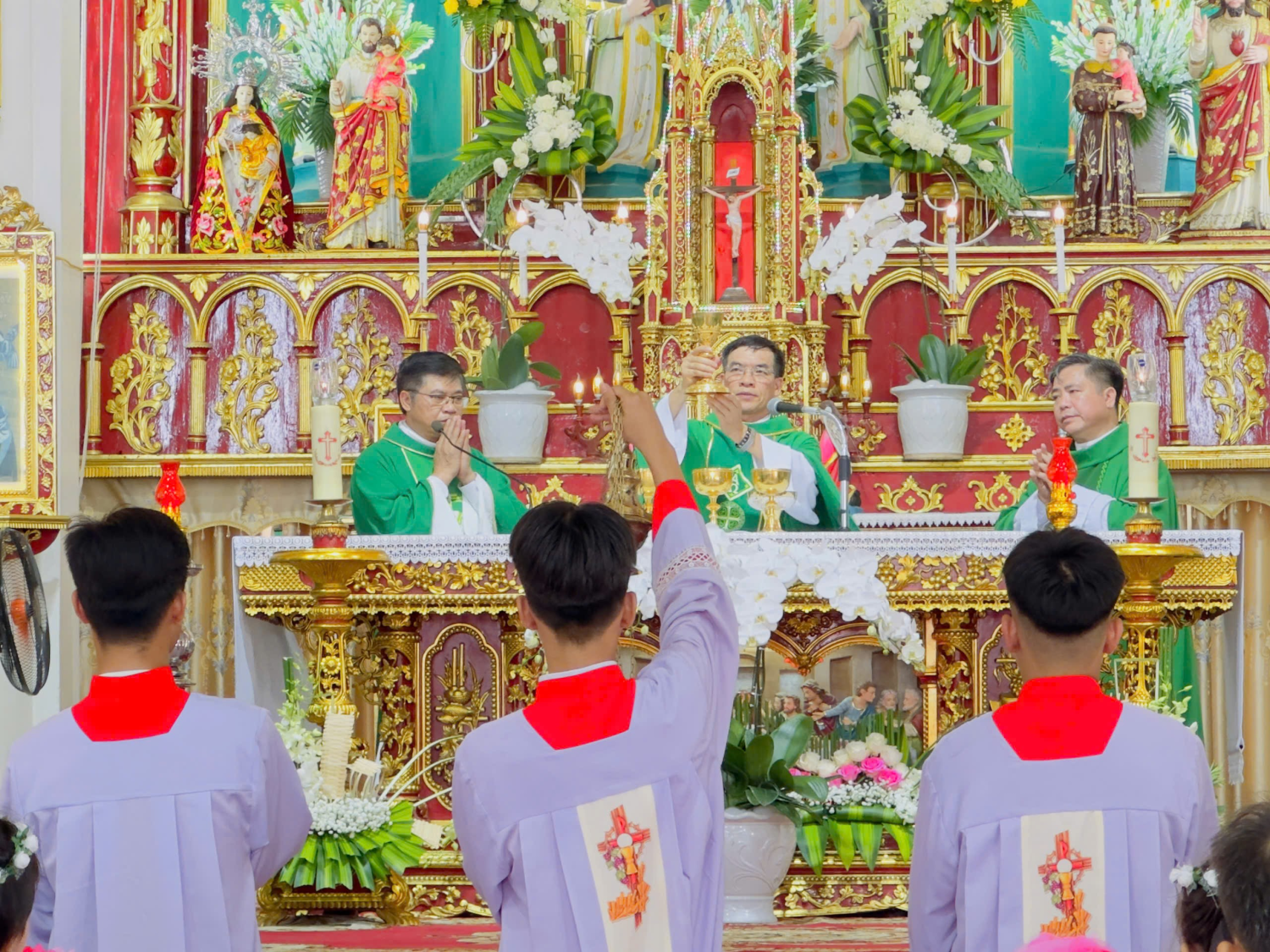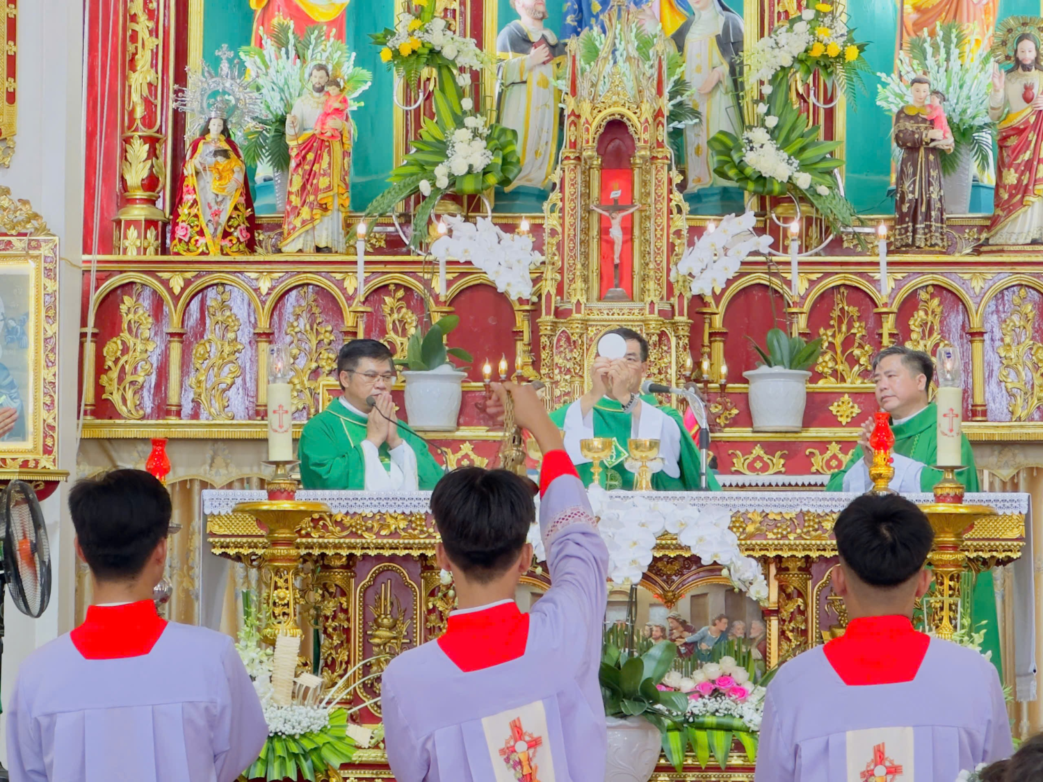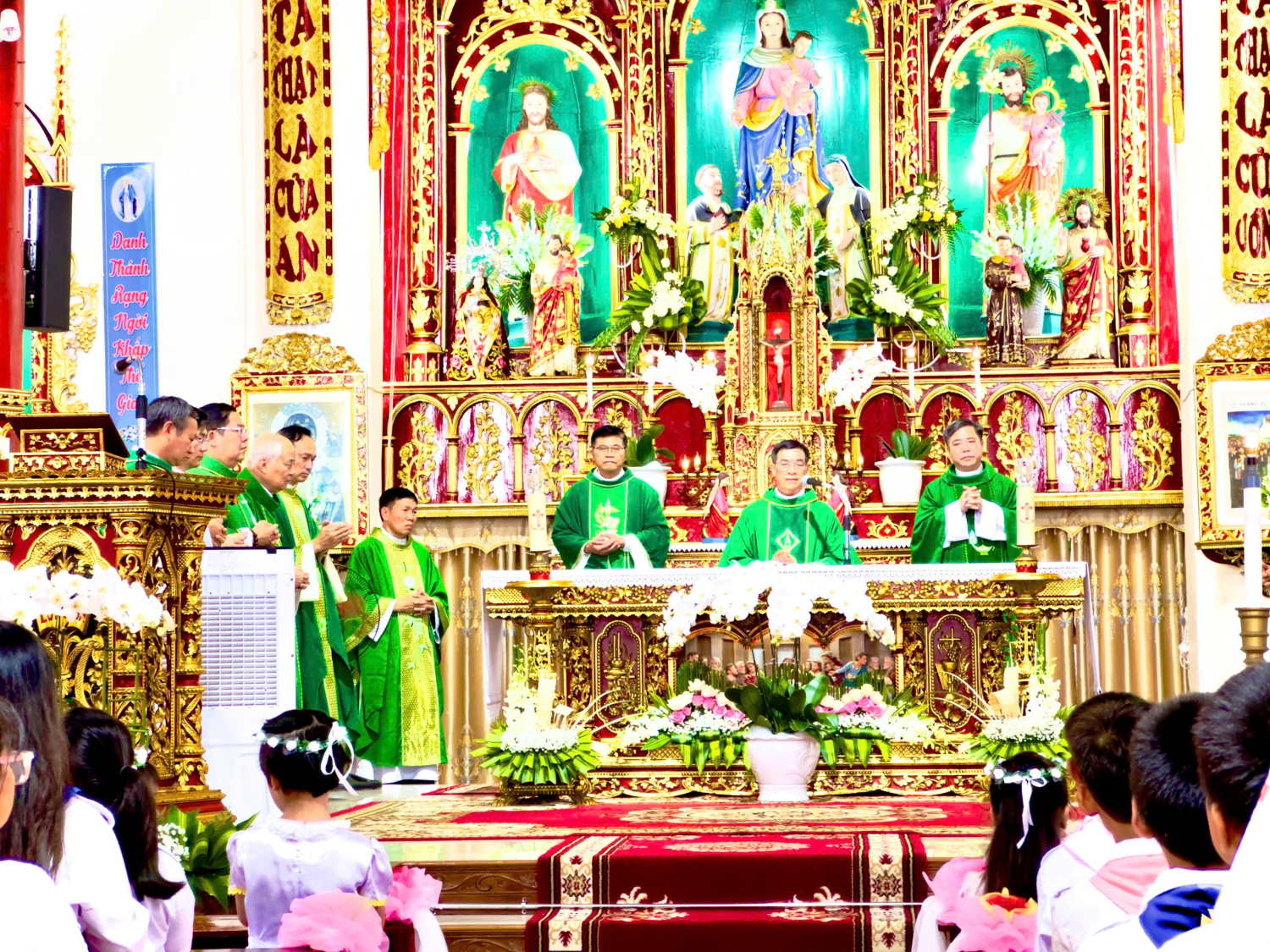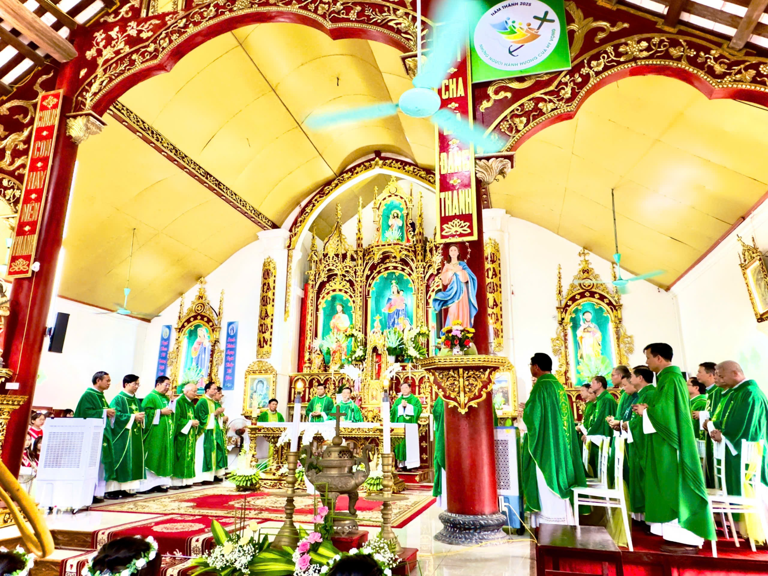 Hiện diện để chia sẻ niềm vui thánh thiêng và hiệp dâng Thánh lễ tạ ơn, cầu nguyện cho Giáo xứ, có Cha chủ tế Giuse Nguyễn Văn Toanh, Quản hạt Tứ Trùng, hơn 30 Cha đồng tế, quý Thầy, quý Dì và đông đảo bà con Giáo dân trong và ngoài Giáo xứ.