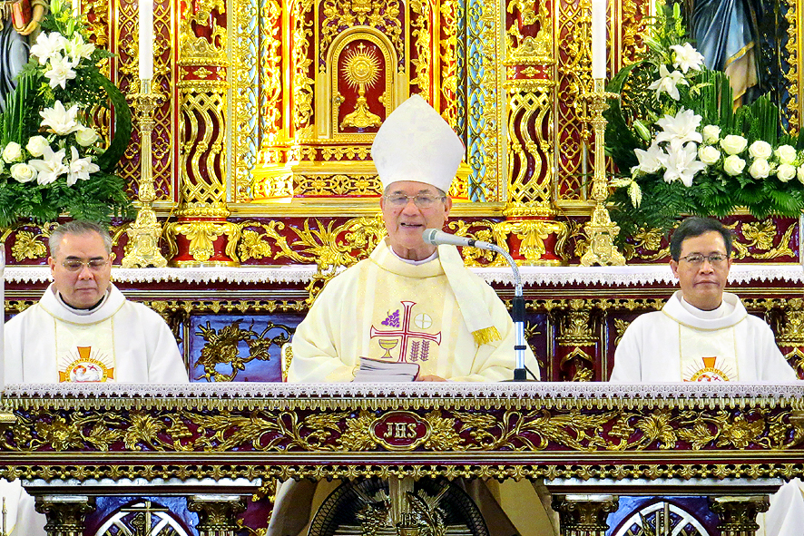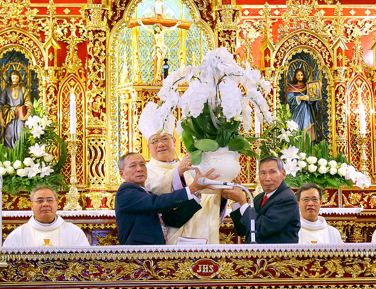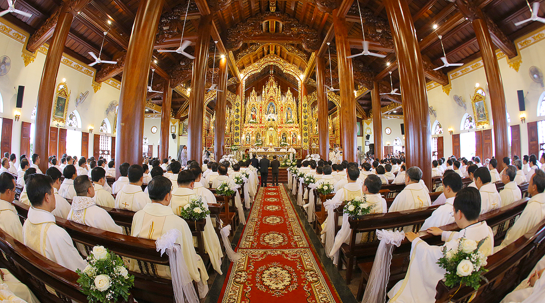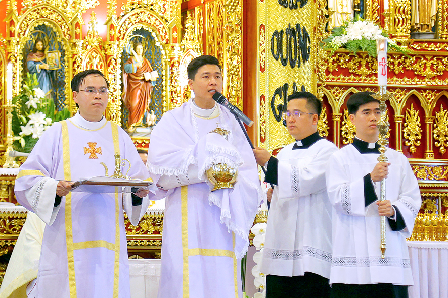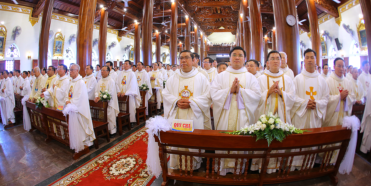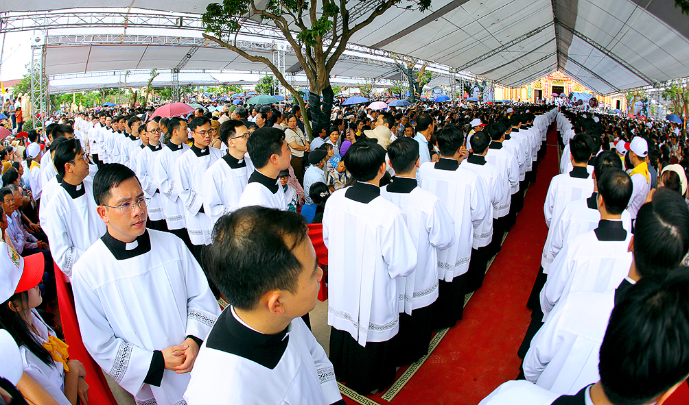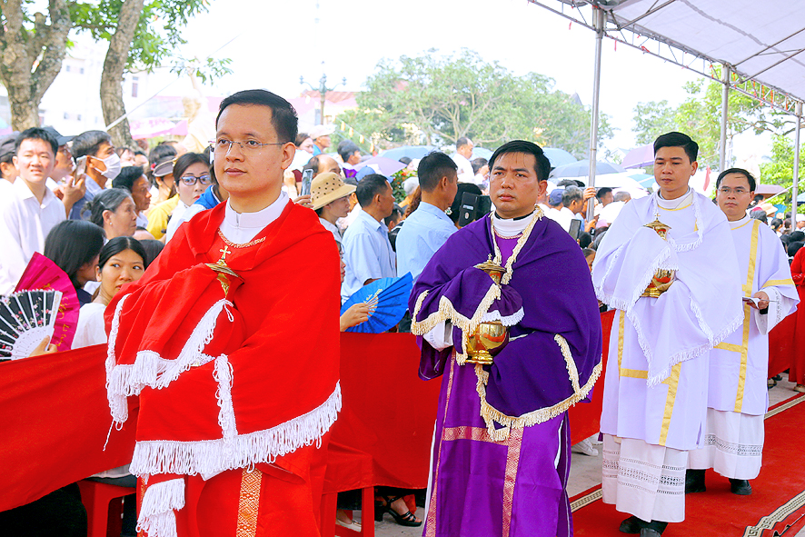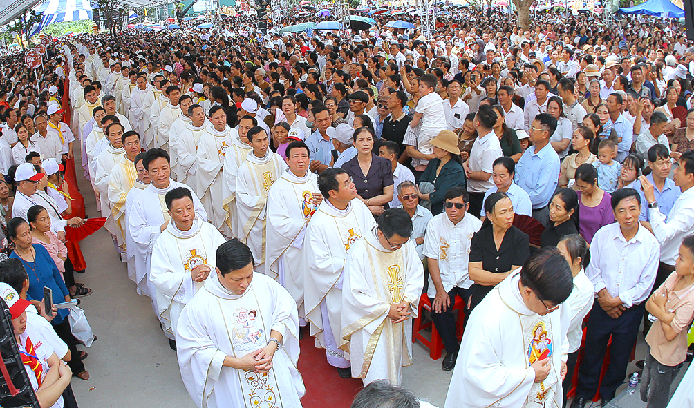 Cao điểm của ngày đại lễ là Thánh lễ do Đức Cha Tôma chủ tế. Cùng đồng tế với ngài có hầu hết quý Cha trong Giáo phận. Thánh lễ cũng có sự hiện diện sốt sắng của quý Phó tế, quý Tu sĩ nam nữ, quý Chủng sinh, và khoảng hơn 50.000 bà con giáo dân từ khắp nơi. Tất cả làm nên một bức tranh thật đẹp về tinh thần hiệp thông trong Giáo hội, nơi mọi con cái Chúa được chính Chúa quy tụ, cùng quây quần bên Bàn tiệc cực thánh mà Thiên Chúa thiết đãi dân Ngài.
