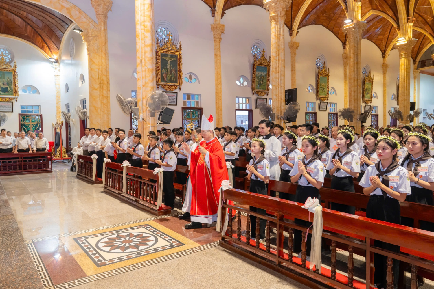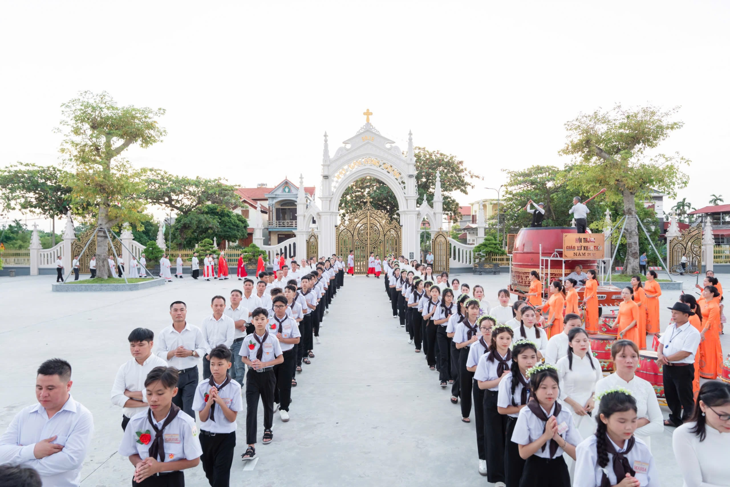 Với niềm háo hức mong đợi thời khắc quan trọng này, các em đã hiện diện tại khuôn viên Thánh đường Giáo xứ Xuân Thủy ngay từ sớm, với trang phục chỉnh tề, đẹp đẽ. Vẻ rạng rỡ trên khuôn mặt càng tô thêm vẻ tươi tắn của các em trong ngày rất đặc biệt này. Trước Thánh lễ, các em đã cùng với đoàn lễ nghi, giữa tiếng kèn, tiếng trống rộn ràng, vui tươi, trang nghiêm tiến vào Nhà thờ để tham dự Thánh lễ ban Bí tích Thêm Sức do Đức Cha Tôma chủ tế.