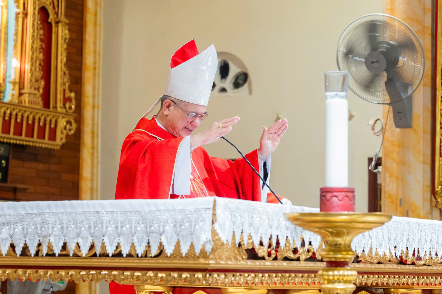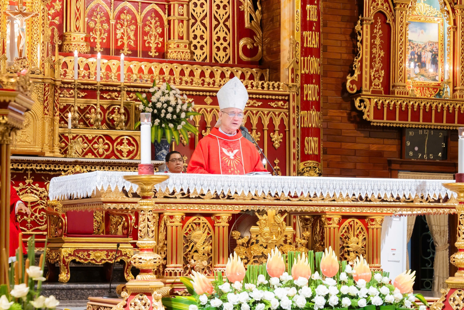Mở đầu Thánh lễ cũng như trong bài giảng, Đức Cha Tôma đã quảng diễn để giúp cộng đoàn ý thức được tầm quan trọng của bảy ơn Chúa Thánh Thần trong đời sống người Kitô hữu. Trong bảy ơn này, có bốn ơn giúp mở mang trí khôn, dẫn đưa người tín hữu đến sự hiểu biết các mầu nhiệm trong đạo, là ơn khôn ngoan, thông hiểu, suy biết, lo liệu. Ba ơn còn lại giúp các Kitô hữu áp dụng những hiểu biết đó vào trong đời sống cụ thể, bằng cách trung thành tuân giữ các giới răn trong đạo, sống xứng đáng là con ngoan của Thiên Chúa, đó là các ơn: sức mạnh, đạo đức, kính sợ Thiên Chúa. Khi đã ý thức về sự cao trọng của Bảy ơn Chúa Thánh Thần, Đức Cha mời gọi cộng đoàn phải biết quý trọng, gìn giữ những ơn này, không chỉ trong những dịp đặc biệt, nhưng là trong suốt cuộc đời. Tuy nhiên, tự sức riêng của mình, con người không thể gìn giữ ơn Chúa Thánh Thần trong suốt cuộc đời. Vì thế, Đức Cha khuyên nhủ cộng đoàn hãy biết cầu nguyện với Chúa Thánh Thần hằng ngày, bằng những lời kinh hết sức quen thuộc, là kinh Cúi xin Chúa sáng soi và kinh Chúa Thánh Thần, hoặc bằng lời nguyện tắt đơn sơ nhưng đầy tín tác: “Lạy Chúa Thánh Thần xin đến giúp con”.