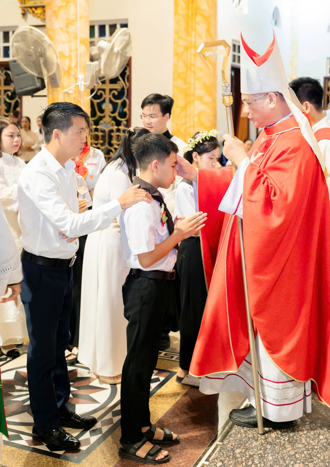 Nghi thức ban Bí tích Thêm Sức được cử hành ngay sau bài giảng, với phần chính yếu là việc Đức cha Tôma đặt tay, đọc lời nguyện thánh hiến, cầu xin Chúa Thánh Thần tuôn đổ tràn đầy Ơn Thánh của Ngài trên các em. Tiếp đến, các em, theo sau là cha mẹ đỡ đầu, đã trang nghiêm tiến lên, để được lãnh nhận ấn tín ơn Chúa Thánh Thần, qua việc Đức Cha xức dầu Thánh trên trán từng em.