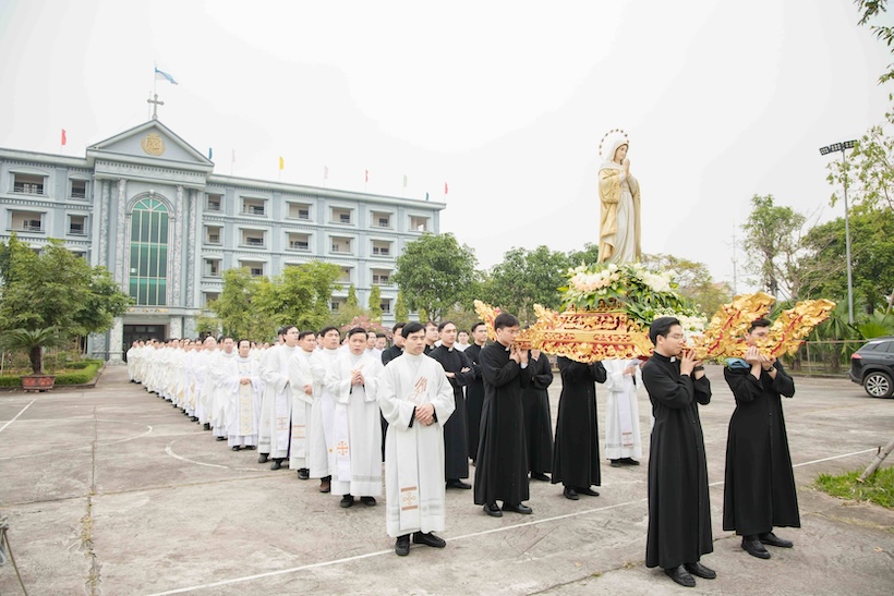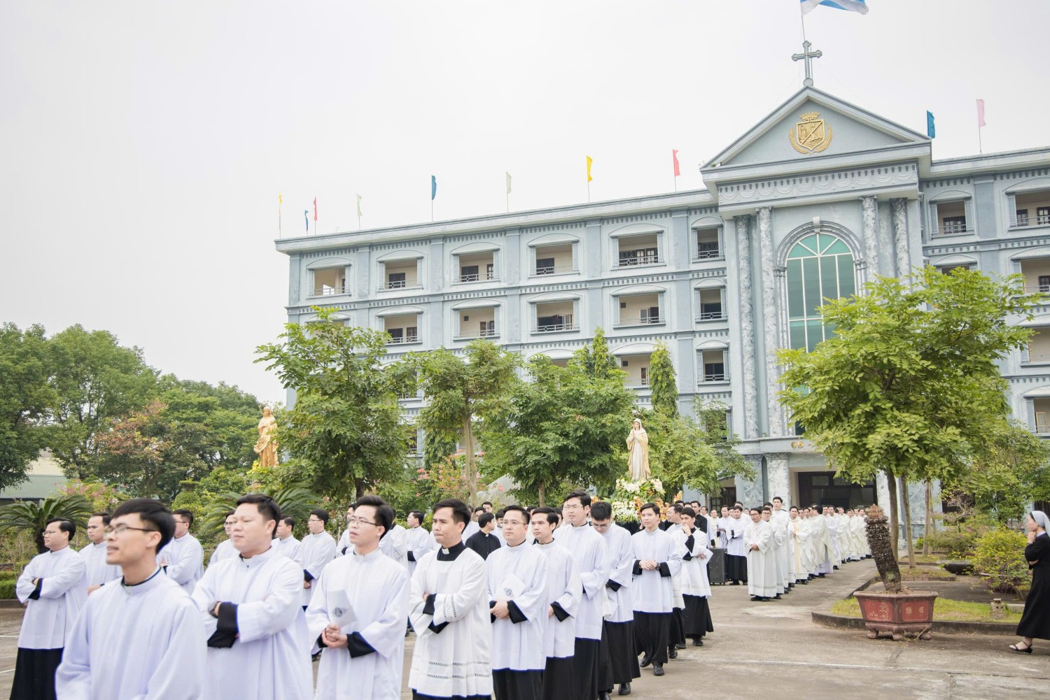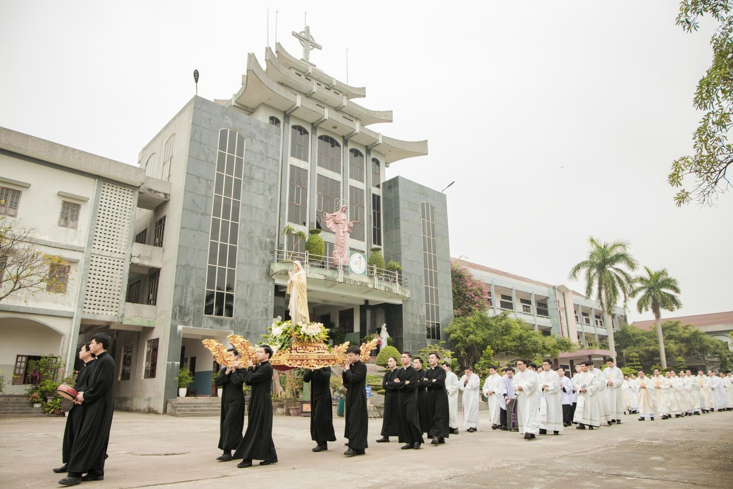 Trước Thánh Lễ, đoàn rước long trọng cung nghinh Đức Mẹ từ Ban Triết tiến về Nhà thờ Chính Tòa đang dần hoàn thiện trong lời kinh Mân Côi. Sự hiện diện của các thế hệ đã tạo nên một hình ảnh thật đẹp. Cuộc rước kiệu ấy không chỉ là nghi thức của ngày lễ, mà còn như một dòng ơn gọi âm thầm chảy qua, nối liền quá khứ với hiện tại và tương lai. Những bước chân đã đi qua chặng mở đầu của Chủng viện năm nào, nay lại hòa vào nhịp bước trẻ trung của những người đang được đào luyện, nhẹ nhàng như truyền lại một ngọn lửa vẫn cháy bền trong mái trường mang danh Mẹ Vô Nhiễm. Đó là khoảnh khắc của một sự tiếp nối thiêng liêng không ồn ào, sâu lắng, bền bỉ và đầy hy vọng.